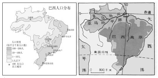 材料一:“巴西人口分布图”和“巴西地形图”