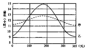 3、单选题 某学生收集了当地(甲)与姐姐留学所在地(乙)的全年每一天的昼长资料,并绘成图(下图)。读图完成下列各题。