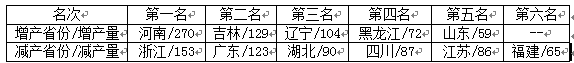 4、单选题 1997年至2007年,我国粮食生产格局发生了重要变化,“南粮北调”逐渐演变成“北粮南调”。下表为1997年至2007年我国粮食增产省份和减产省份统计表(单位:亿斤)。据此回答下列各题。