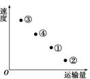 本题解析:根据图示不同交通运输方式的速度和运量的比较分析,③速度最快,运量最小,故判断为航空;②运量最大,速度最慢,判断为水运;铁路和公路比较,铁路的运量更大,故判断①为铁路,④为公路。