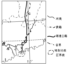小题1:根据图示的经纬度位置和省区轮廓判断,G位于江西省,简称赣;经过江西省到香港九龙的是京九线。