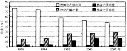 5、单选题 下图是我国1978年~2005年东部沿海地区农业产值结构变化统计图,完成下列各题。