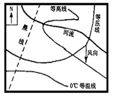【小题1】从图示风向分析,该风向是右偏形成的,所以该地位于北半球;因中纬度该地气温在0°C左右,所以可以判断此时为冬季,该日昼短夜长;中纬度地区不会形成热带季雨林;而该河流不是从低纬度流向高纬度,所以无凌汛现象。故选C。