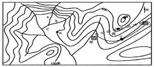 1.图中的①②③④四地中不能看丙村的地点是:2.下列叙述错误的是: