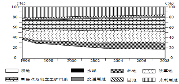 材料一:1996-2008年西宁市土地利用类型结构变化图(图1)