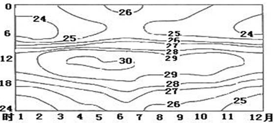 1、单选题  下图为“某地一年中气温日变化的分布图”,读图回答28~30题: