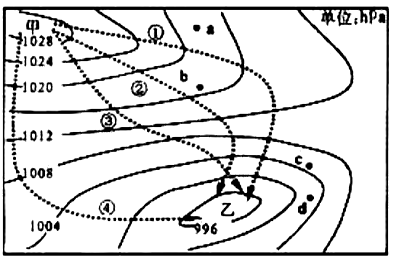 【小题2】此时,图中 a、b、c、d 四地最有可能出现阴雨天气的是(   )