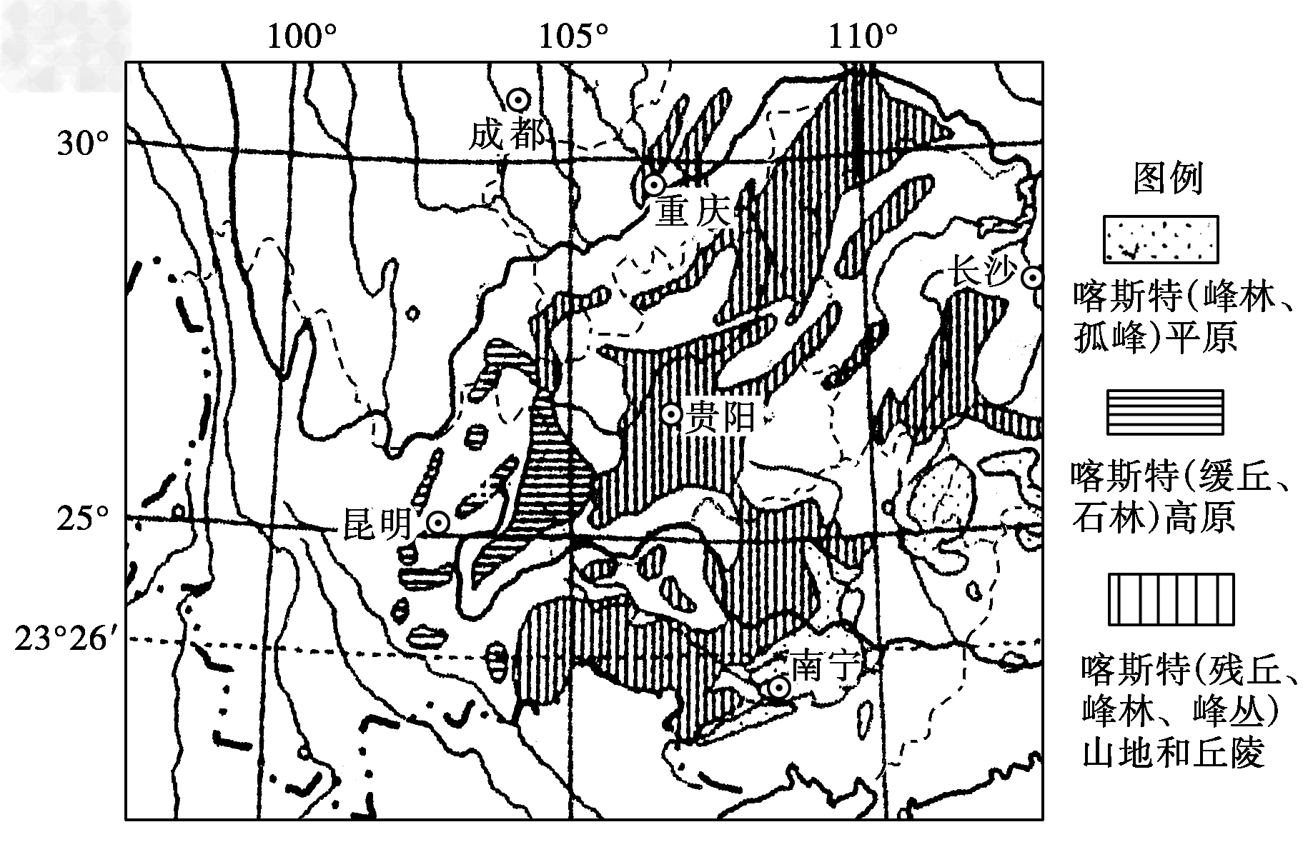 5、单选题 读“某区域喀斯特地貌分布图”,据此回答1~3题。?