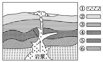 小题1:通过地层剖面图考查地层形成的先后顺序。从图中可知该区域发生过岩浆活动,岩浆上升时穿透破坏了⑥④③②岩层,由此可知此处最先形成了⑥④③②各层,其后发生了岩浆活动,因而最晚形成的应为与岩浆活动有关的①⑤岩层。