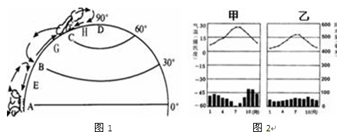 (2)图1中G带的风向是________,图2中位于亚欧大陆西岸全年受该风带控制的是 (甲/乙)城市,其气候特点是________________。