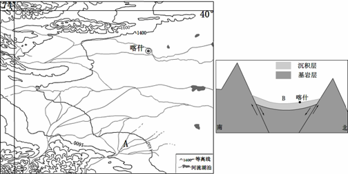 材料一 2010年5月,中央新疆工作会议上中央正式批准喀什设立经济特区。喀什是中国的西大门,它地处亚欧大陆中心,边境线长达982公里,与五国接壤,有6个国家一类口岸对外开放,具有“五口通八国,一路连欧亚”的独特区位优势。图为该地所在区域图和地质剖面图。