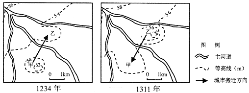【小题2】根据上题分析,排除A、B项;从图中城市搬迁方向可知从海拔低的地方搬迁到海拔高的地方,因城市位于河流谷地,易出现水灾,故搬到高地,所以选C项。
