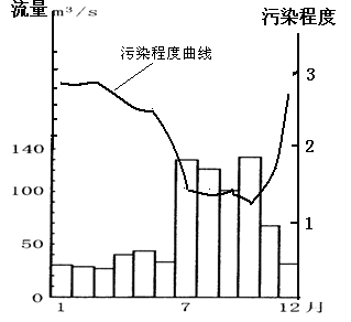 1、综合题  ?人类的不恰当活动,常造成严重的水质污染,从而破坏了水体环境。下图是黄河中游某支流一水文站流量和污染程度的实测结果,据此回答下列问题。