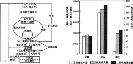 1、单选题 下左图为生态系统中的硫循环示意图,右图为我国三省原煤生产量、煤炭消费量和二氧化硫排放量柱状图。读图回答问题。