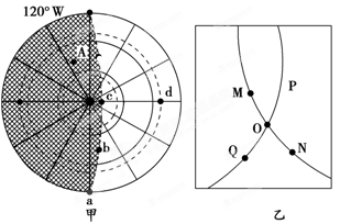 (2)若乙图为甲图中晨昏线与某条经线相交位置图,且O点的地方时为6时10分,则O点所在地是? ( )(2分)
