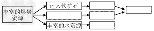 (1)随着大型铁矿的开发,该地将建立焦化厂、钢铁厂、发电厂和水泥厂,请把这四个工厂的名称填入工业联系图中的A、B、C、D处。(4分)