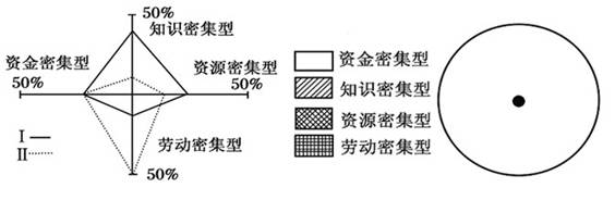 (1)读图,模式Ⅱ劳动密集型约占50%,资金密集型约占25%,知识密集型约占10%,资源密集型约占15%。依据图例,在右图中画出饼状图。模式Ⅱ属于劳动密集型产业,有利条件是劳动力资源丰富; 工资水平较低。
