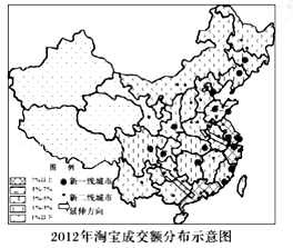 1、单选题 2012年12月3日,阿里巴巴集团在杭州宣布,至11月30日晚9:50,其旗下淘宝和天猫的交易额本年度突破10000亿元;2013牟“双十一”网购狂欢节一天的支付宝交易额达350.19亿。读图完成下列各题。