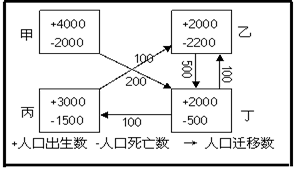 3、单选题 图为人口规模相当的甲乙丙丁四座城市某年人口资料图,读图完成问题。