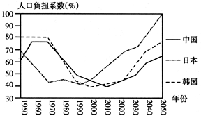 4、单选题 下图为中国、日本和韩国百年人口负担系数比较图[人口负担系数=(14岁及以下人口数+65岁及以上人口数)/(15——65岁人口数)× 100%,读图回答各题。