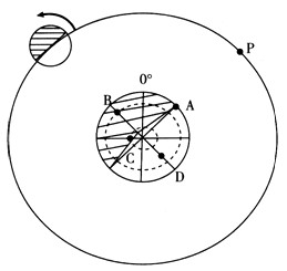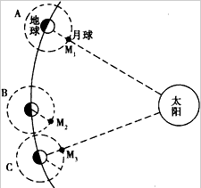 ? 图中实线表示地球围绕太阳公转的轨道,圆形虚线表示月球围绕地球公转的轨道,地球以每天约1。的速度在轨道上自西向东运行。当地球从A运行至B时,月球正好自M1至M2绕地球公转了一周。