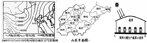 2、单选题 山东半岛每年冬季都有大雪降临。特别是2005年12月份以来,我国遭到持续冷空气的袭击。在威海和烟台,短短20多天下了三场强降雪,出现了50年来罕见的雪情。近年来,山东已成为我国北方地区重要的蔬菜生产基地之一。据此回答题。