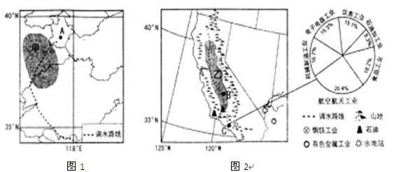 本题解析:先空间定位,根据图示经纬度和海陆分布确定甲区域是华北平原,A城市为天津(南水北调);乙区域为美国西部,C是洛杉矶(北水南调)。