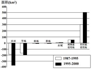 1、单选题 下图表示安徽省1987-1995年和1995-2000年两个时段土地利用变化。完成下列问题。
