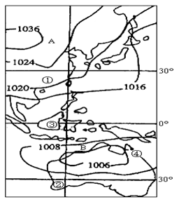 【小题1】(4分)此图表示的时间是   (1或7)月。B处盛行风的风向为