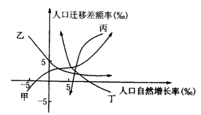 5、单选题 下图表示1978~2008年期间,甲、乙、丙、丁四城市人口变动统计情况图(人口迁移差额率为人口迁入与迁出的差额占总人口的比重)。回答下题。