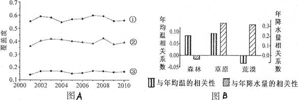 1.图A中曲线①、②、③分别代表2.内蒙古2001~2010年植被覆盖度的变化特点及其与气候要素相关性为