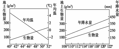 3、单选题 生物量一般是指生物在某一特定时刻单位空间的个体数、重量或其含能量。下图是“我国某区域地上生物量、年均温和年降水量随经纬度的线性变化示意图”。读图回答下列各题。