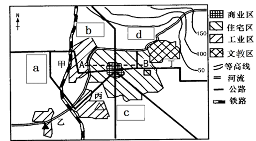 小题1:本题考查住宅区的分化。高级住宅区一般和文化区、风景区结合在一起,环境污染小,图中丁为文教区,所以d处可能建立高级住宅区。所以本题选择D选项。