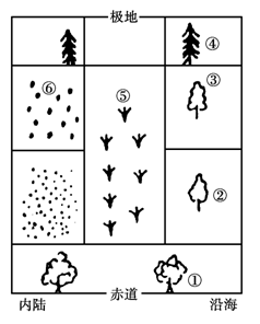 (1)自然景观从①一②一③一④的变化所表现出来的地域分异规律是_____?______?___ ;自然景观从③一⑤一⑥的变化所表现出来的地域分异规律是______________。(2分)