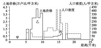 1.图示甲地土地价格和人口密度均很低,合理的解释是2.乙地土地价格高,人口密度低,应属于3.丙地在城市中