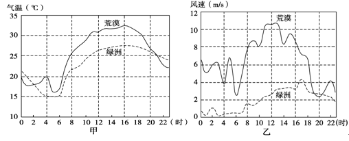 1、综合题 图甲、图乙分别记录了我国西北某地绿洲和邻近荒漠某年6月1日(晴天)近地面层大气温度和水平风速日变化状况。读图回答问题。(10分)