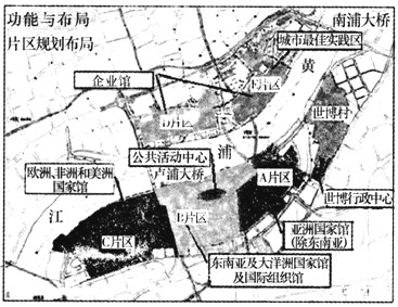 1、世博同区落足于黄浦江两岸,其布局考虑的主要因素是