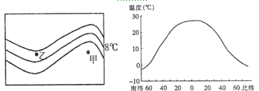 3、填空题 下图左为“某海域表层海水等温线分布示意图”,甲、乙两处分别位于大洋的东、西两侧。下图右为“海水表层温度随纬度的变化图”。读图完成下列各题。