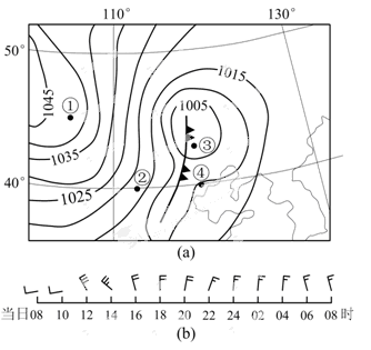 2、单选题 图(a)为某日08时海平面气压分布图(单位:百帕),图(b)显示④地上24小时内风的变化。读图,回答下题。