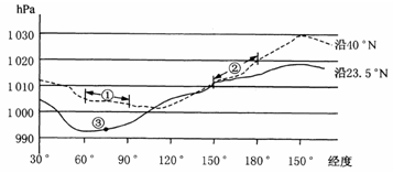 3、单选题 图是某月份海平面平均气压沿两条纬线的变化图,读图回答下列各题。