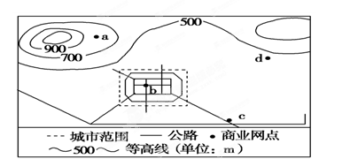 小题1:商业网点的经济效益高低与人口数量、消费水平、交通状况等因素有关,从图示知道,b在城市中心,人口多、消费水平高、交通便利、效益最好;c离城市近,且交通便利;a和d都远离城市,交通不便,且a位于山区,效益最差。