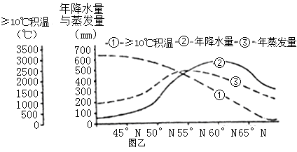 材料三:沿50°E年降水量、蒸发量和≥10℃积温图乙