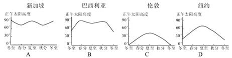 2、单选题 下列四座城市正午太阳高度季节变化的示意图,接近实际的是