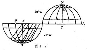 4、综合题 图1一9中,北半球是东半球,南半球是西半球,回答下列问题:(10分)