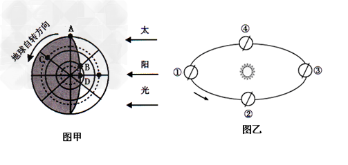 (1 )图甲是以____________ 极点为中心的半球图,图中AD 线表示晨昏线中的____________ 线。
