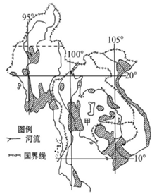 2.图中甲国为泰国,泰国北部为山区,南部是低平的湄南河平原地形上易于洪水的聚集再加上该国位于热带季风气候区,西南季风强的时候容易形成洪水。故选D项。