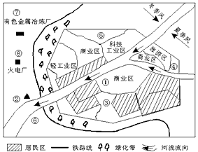1、综合题 读“某城镇工业布局简图”,回答以下问题。