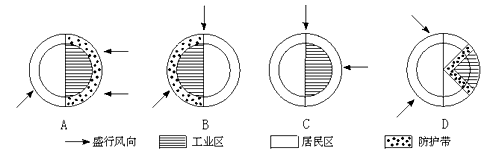 3、单选题 图是“某城市建设规划方案图”,从环保角度考虑,其中合理的是