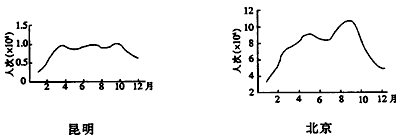 4、单选题 下图是北京、昆明两地的旅客流量统计示意图,读图判断1—2题。