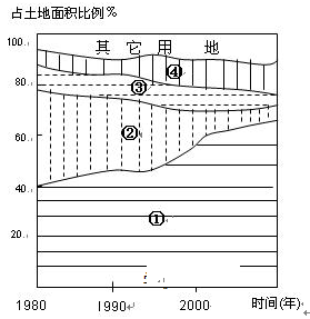 读图,城市占面积最大的功能区是住宅区,所以①是住宅区,B、C错。经济发展水平是城市发展水平的标志,所以工业区面积占第二位,②是工业区,A对。D错。随着城市的发展,商业会不断繁荣,占地面积增大,④是商业区,城市规模扩大,人口增长过快,导致行政及绿化区面积在2010年间有所减小,③是行政及绿化区。所以A对。